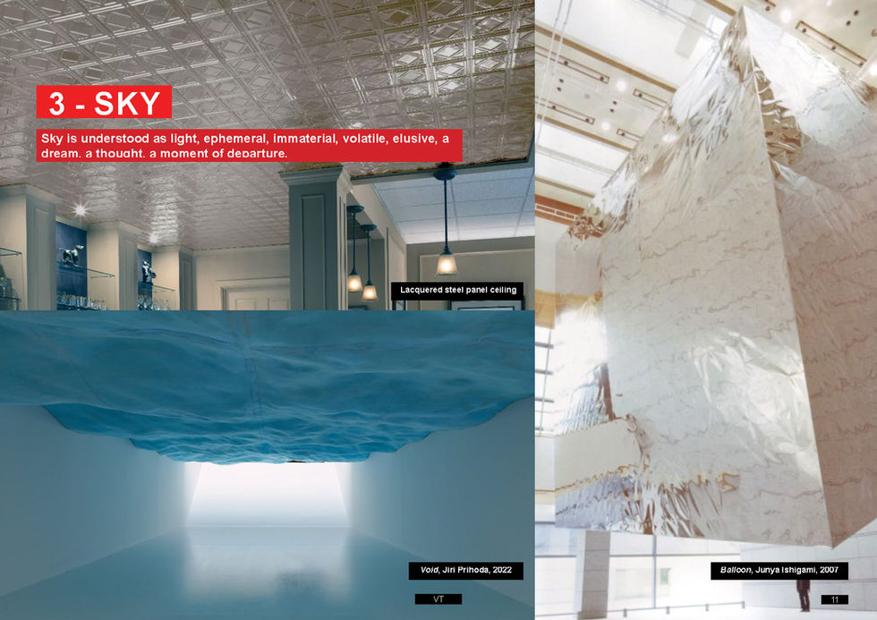 The room is divided into 3 components - earth, sky and the in-between. Whereas the earth and the sky aspects are frequently articulated in architecture and pop-culture alike, the in-between is hard to grasp. It is not to be understood as left-over, residual space. Instead it is the main substance, the one that is created through human occupation. The tangible is only the supporting actor. The in-between is ultimate missing sculpture.